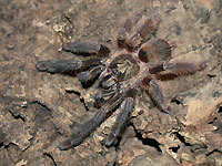 Subadulte Psalmopoeus reduncus am Eingang Ihres Wohngespinstes